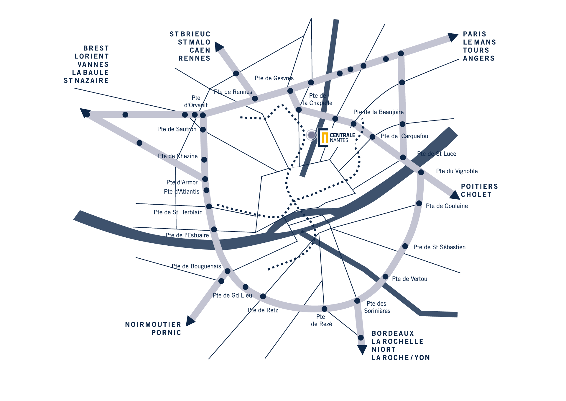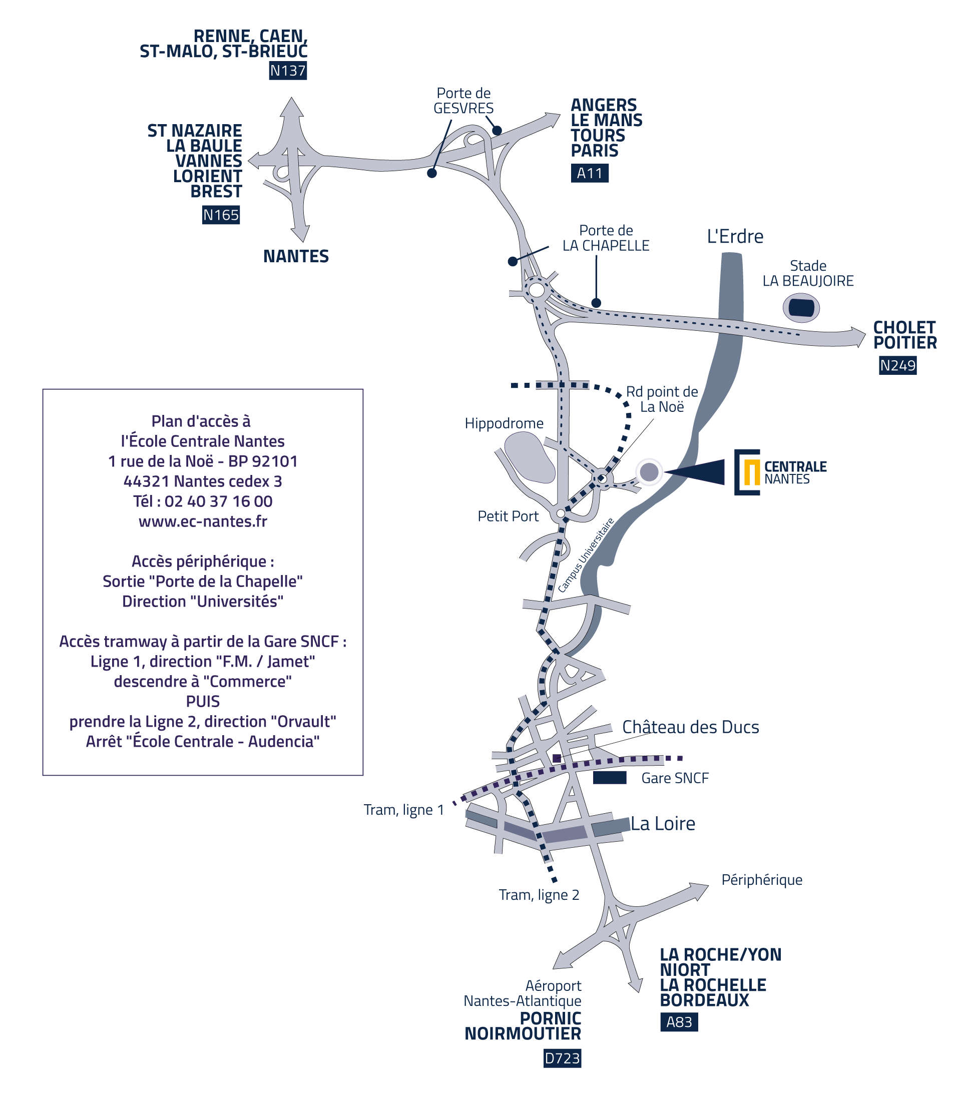 Depuis la gare Depuis la sortie Nord de la gare, prenez le tram ligne 1, direction F. Mitterand / Jamet. Descendez à l'arrêt Commerce. Prenez enseuite le tram ligne 2, direction Orvault Grand-Val et descendez à l'arrêt Ecole Centrale - Audencia. Centrale Nantes se situe à proximité de cet arrêt. Un ticket coûte 1,90€ et est valable pendant une heure après que vous l'avez composté. Il peut aussi être utilisé sur les lignes de bus et les autres lignes de tram. La plupart des résidences universitaires sont situées deux arrêts de tram après l'arrêt École Centrale - Audencia. Depuis l'aéroport L'aéoroport international Nantes Atlantique est situé à environ 10 km au Sud de Nantes. La navette Tan air (7,50€) vous emmènera dans le centre-ville. Vous pouvez également prendre un taxi, ce qui vous coûtera environ 50€.